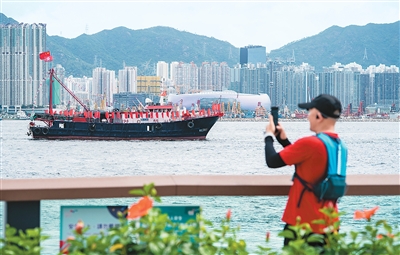 七月一日,由香港各界慶典委員會(huì)組織的二十八艘漁船在香港維多利亞港海面巡游。