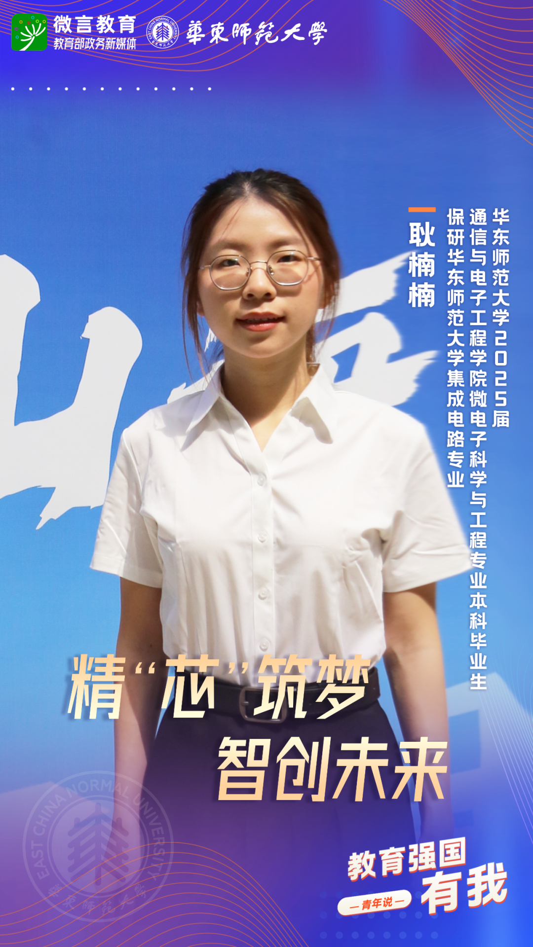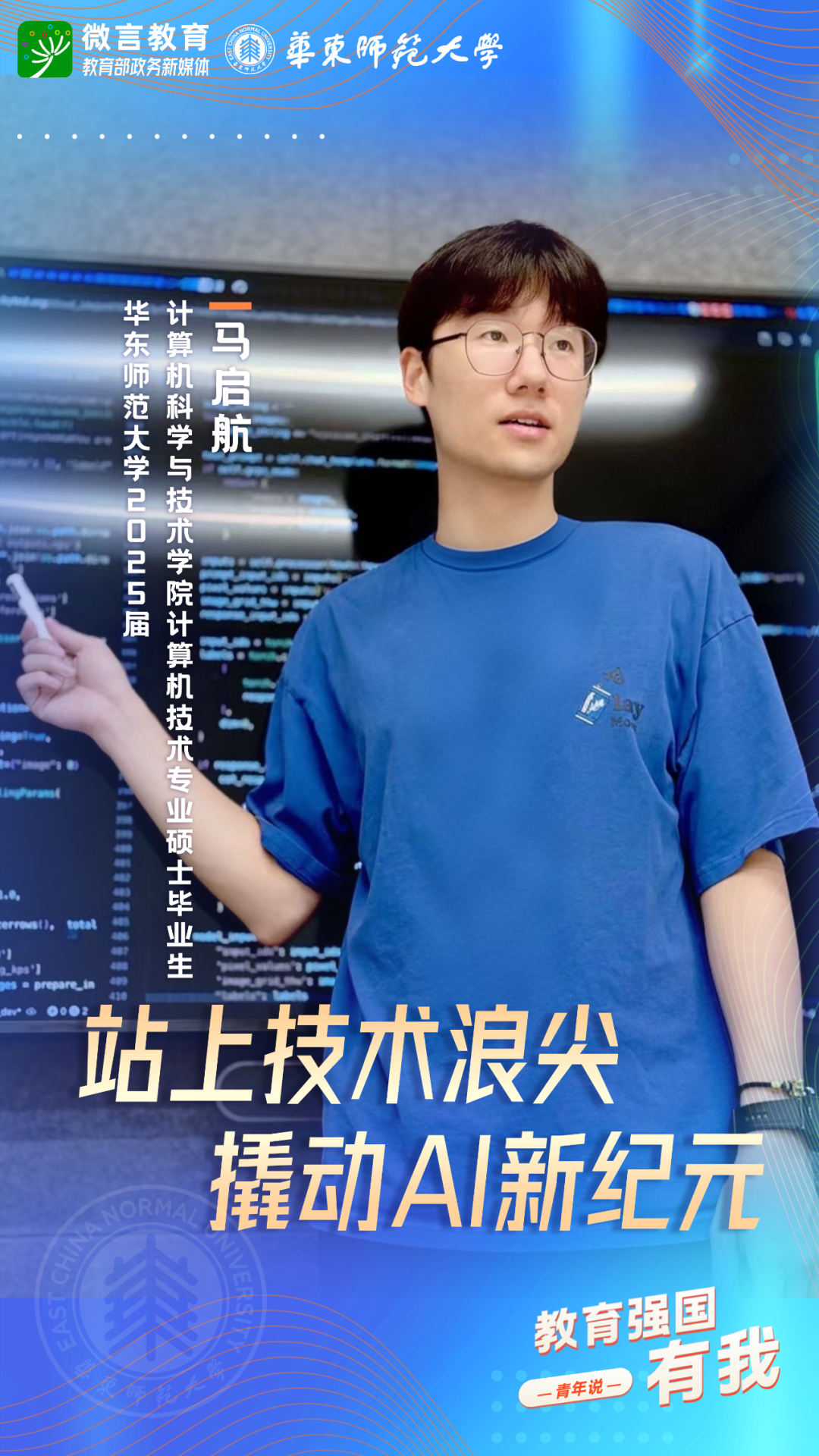 習近平總書記強調(diào),希望廣大青年堅定理想信念,厚植家國情懷,練就過硬本領(lǐng),發(fā)揚奮斗精神,到祖國和人民最需要的地方發(fā)光發(fā)熱,為中國式現(xiàn)代化建設(shè)貢獻青春力量。教育強國建設(shè),青年何為?教育部政務新媒體推出“教育強國,有我!”網(wǎng)絡(luò)主題宣傳活動之“青年說(報國篇)”系列,展現(xiàn)青年學子將個人理想融入國家發(fā)展的青春擔當。今天,跟教育小微通過1個視頻和1組海報,一起來看華東師范大學學子如何“向新而行”——