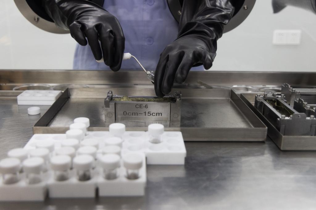 2024年9月24日,科研人員在月球樣品實(shí)驗(yàn)室的解封操作臺(tái)上處理嫦娥六號月球樣品。 新華社記者 金立旺 攝