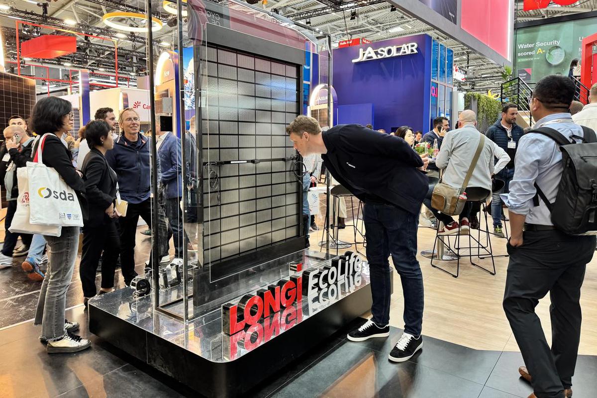 5月8日,參觀者在德國(guó)慕尼黑舉行的2025年歐洲國(guó)際太陽能展上參觀隆基綠能展區(qū)。(圖片來源:新華社)