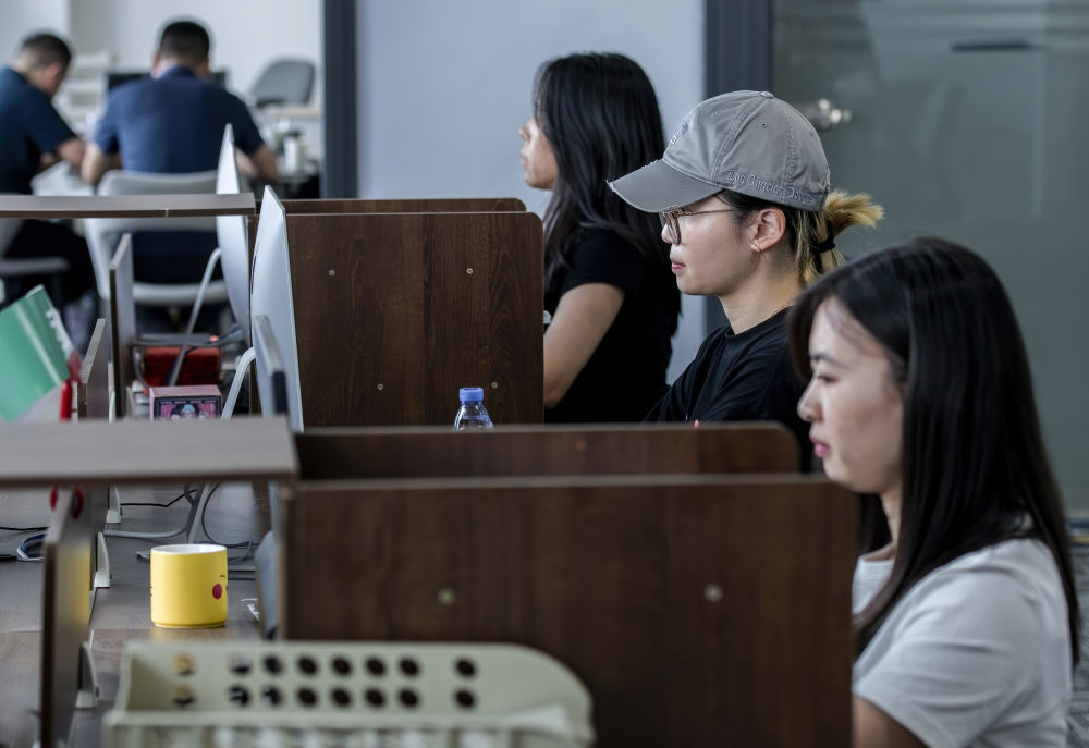 來自華僑大學的臺灣學生(右二)在廈門“臺青創(chuàng)客家”里實習(2024年6月14日攝)。新華社記者 魏培全 攝