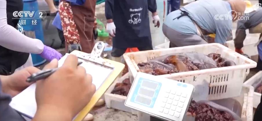 在南漁港碼頭,漁船剛一??浚瑵O民們便爭分奪秒地卸貨、稱重。今年,在煙臺龍口海蜇專項(xiàng)捕撈期,共有41艘漁船成功辦理了海蜇專項(xiàng)捕撈許可證,得以出海作業(yè)。