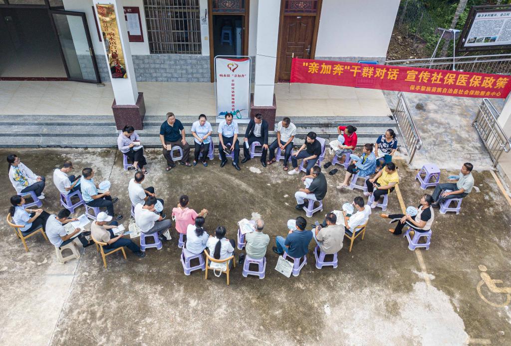 7月16日,在海南省保亭黎族苗族自治縣響水鎮(zhèn)合口村拍攝的“親加奔——干群對話解難題”活動現(xiàn)場(無人機(jī)照片)。新華社記者蒲曉旭 攝