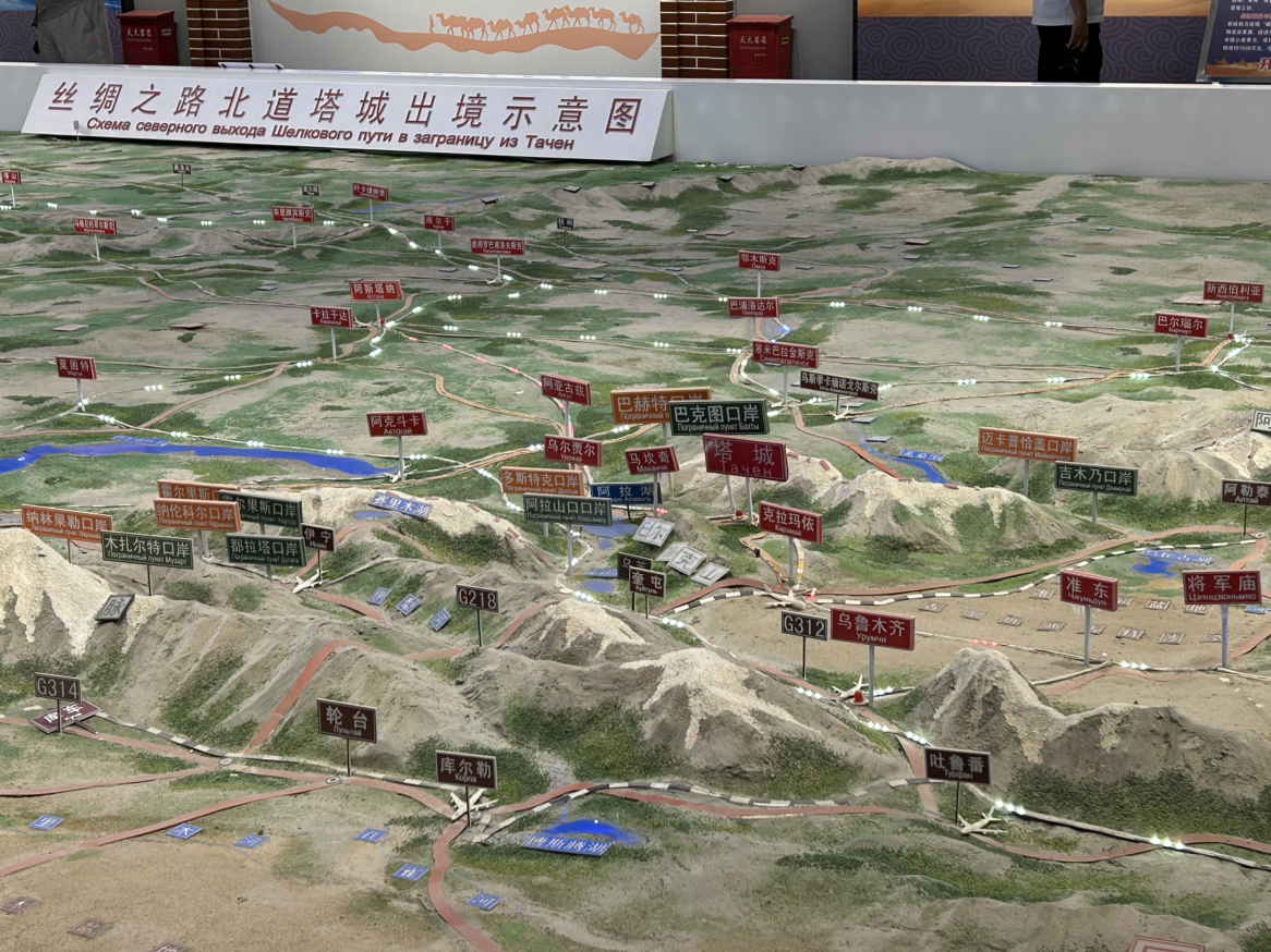 在巴克圖口岸文化展示館,解說員趙倩指著一張乾隆年間的易貨貿易圖介紹:“從1764年民間駝隊往來,到1854年正式通商,這里始終是亞歐大陸重要的貿易走廊?!别^內沙盤清晰呈現“一核、兩廊、三區(qū)”新布局,2025年上半年數據顯示,口岸出入境人員同比增長167.82%,通關時間較往年縮短40%?!艾F在的司機用手機APP就能完成申報,邊民互市‘整進整出’模式讓貿易更高效?!壁w倩說道。
