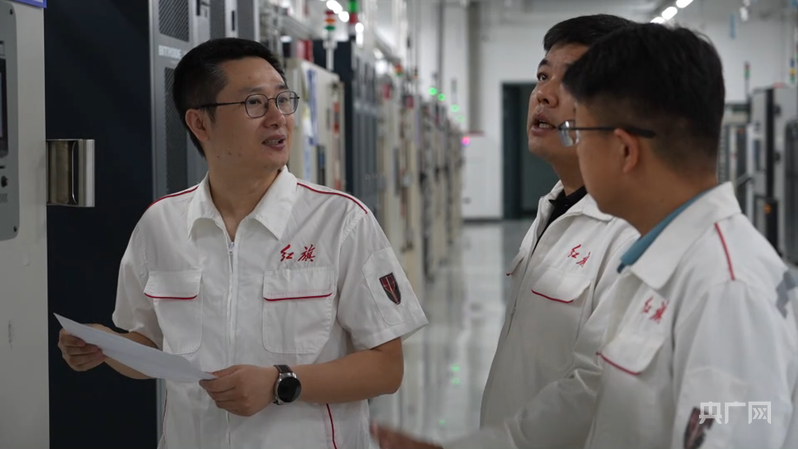 趙洪輝與同事們交流電池安全結(jié)構(gòu)攻關(guān)問題(央廣網(wǎng)記者 舒震 攝)