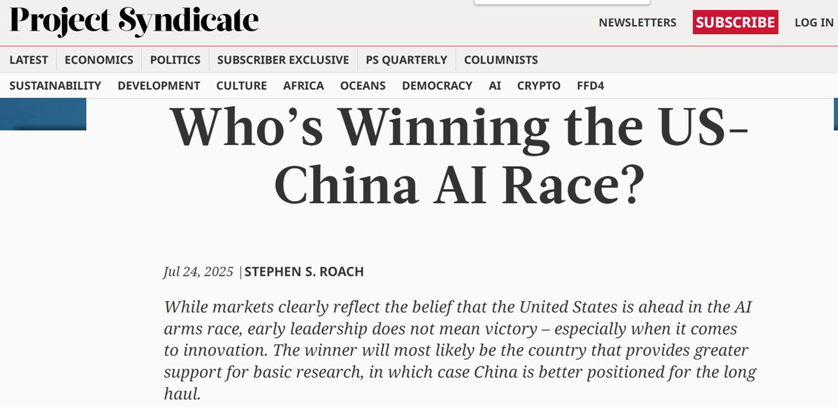 美國摩根士丹利亞洲區(qū)前主席斯蒂芬·羅奇在報業(yè)辛迪加網(wǎng)站(Project Syndicate)發(fā)表文章指出,全球人工智能(AI)競賽的勝負取決于基礎(chǔ)研究的投入,而非短期市場表現(xiàn)。羅奇認為,中國憑借產(chǎn)業(yè)生態(tài)、研發(fā)投入和文化傳統(tǒng),使其在長期競爭中占據(jù)優(yōu)勢。
