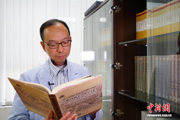 7月24日,澳門理工大學(xué)人文及社會(huì)科學(xué)學(xué)院院長(zhǎng)、澳門口述歷史協(xié)會(huì)會(huì)長(zhǎng)林發(fā)欽翻閱《抗戰(zhàn)時(shí)期澳門日志(上)》?!≈行律缬浾?鄭嘉偉 攝