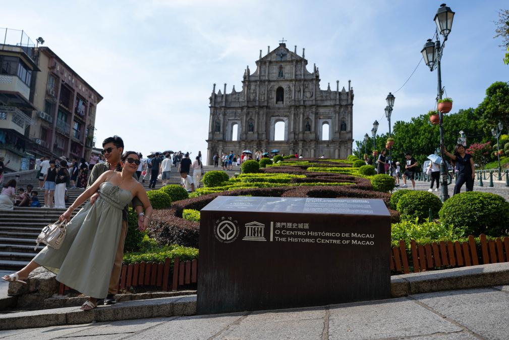 2025年7月9日,游客在澳門大三巴牌坊前游覽。新華社發(fā)(張金加 攝)