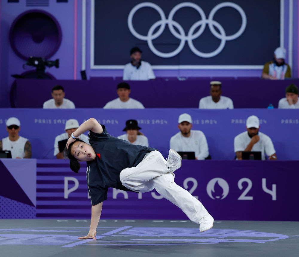 巴黎奧運(yùn)會(huì)霹靂舞女子組比賽,中國(guó)選手曾瑩瑩在比賽中。新華社記者 徐子鑒 攝