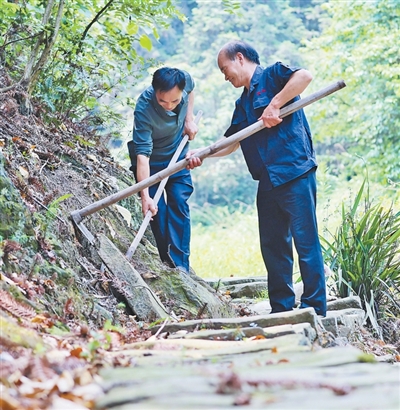 每次上山修路,陳興海和弟弟陳興合都會(huì)帶上鐵鍬、鎬頭、鋤頭、斧頭。“石頭硬得很,我一鎬頭下去,手震得疼!”這樣的日子,兄弟倆一過(guò)就是8年??傞L(zhǎng)約15公里的古道,已經(jīng)修好了約2/3?!拔覀冞€要繼續(xù)往下修。”陳興海說(shuō)。