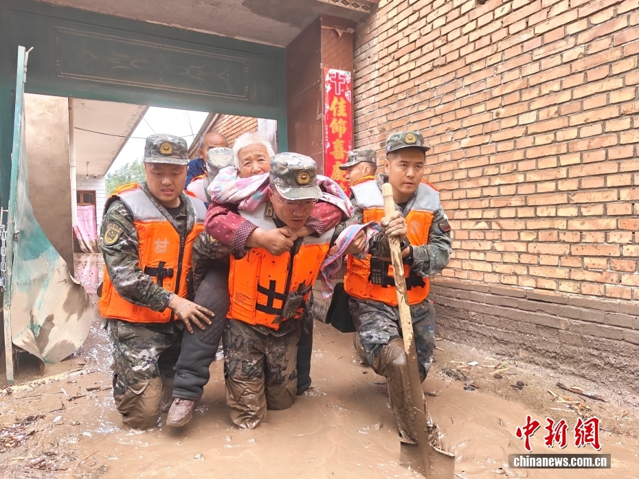8月8日,武警甘肅總隊機動支隊官兵在甘肅省蘭州市榆中縣興隆山村轉移被困群眾。劉昆 攝