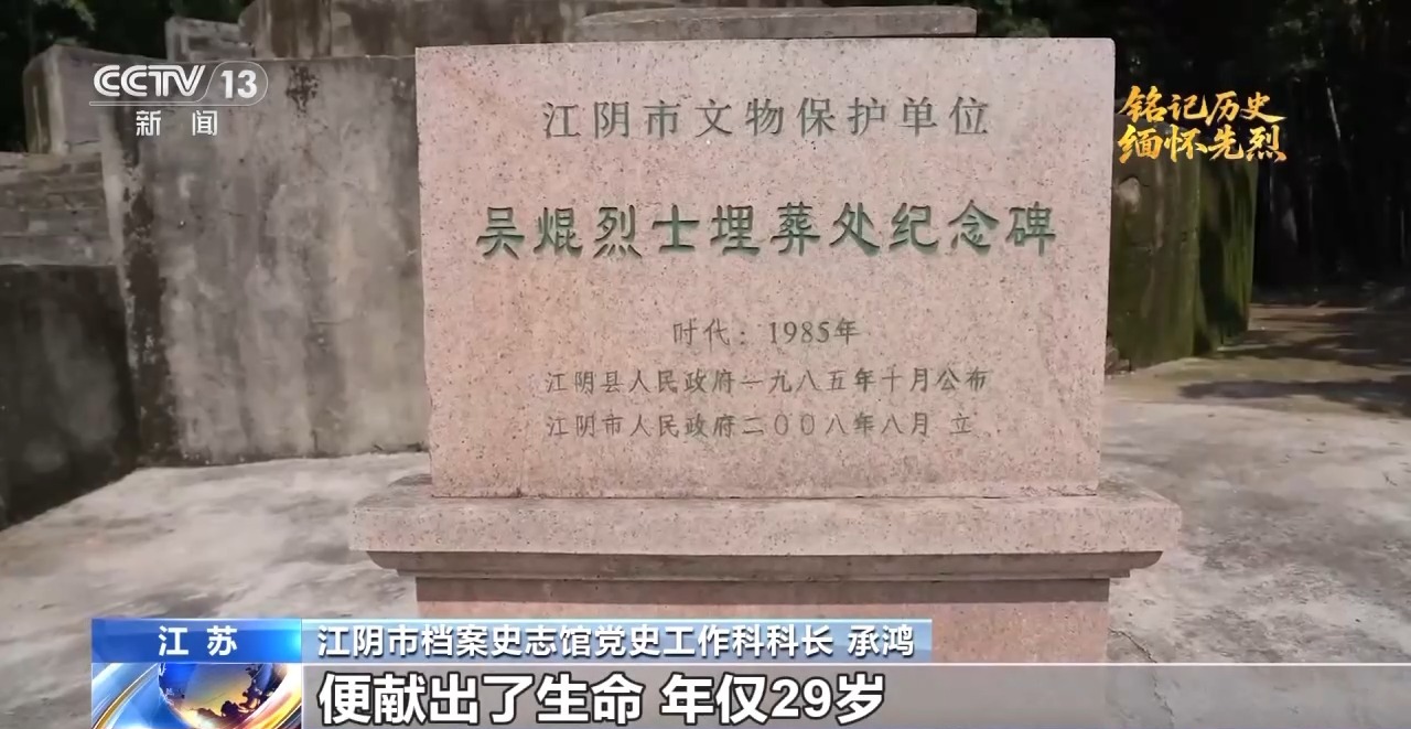 江陰市檔案史志館黨史工作科科長(zhǎng) 承鴻:他率領(lǐng)部隊(duì)進(jìn)軍的時(shí)候,遭到了國(guó)民黨軍隊(duì)的冷槍,吳焜頭部中彈,未及留下只言片語(yǔ),便獻(xiàn)出了生命,年僅29歲。吳焜參加過(guò)長(zhǎng)征,歷經(jīng)艱難險(xiǎn)阻,在作戰(zhàn)和訓(xùn)練當(dāng)中,處處以身作則,率先垂范。他指揮作戰(zhàn)時(shí)經(jīng)常沖在第一線,非常勇猛,正是依靠這種精神和作風(fēng),讓新四軍成為鐵軍。