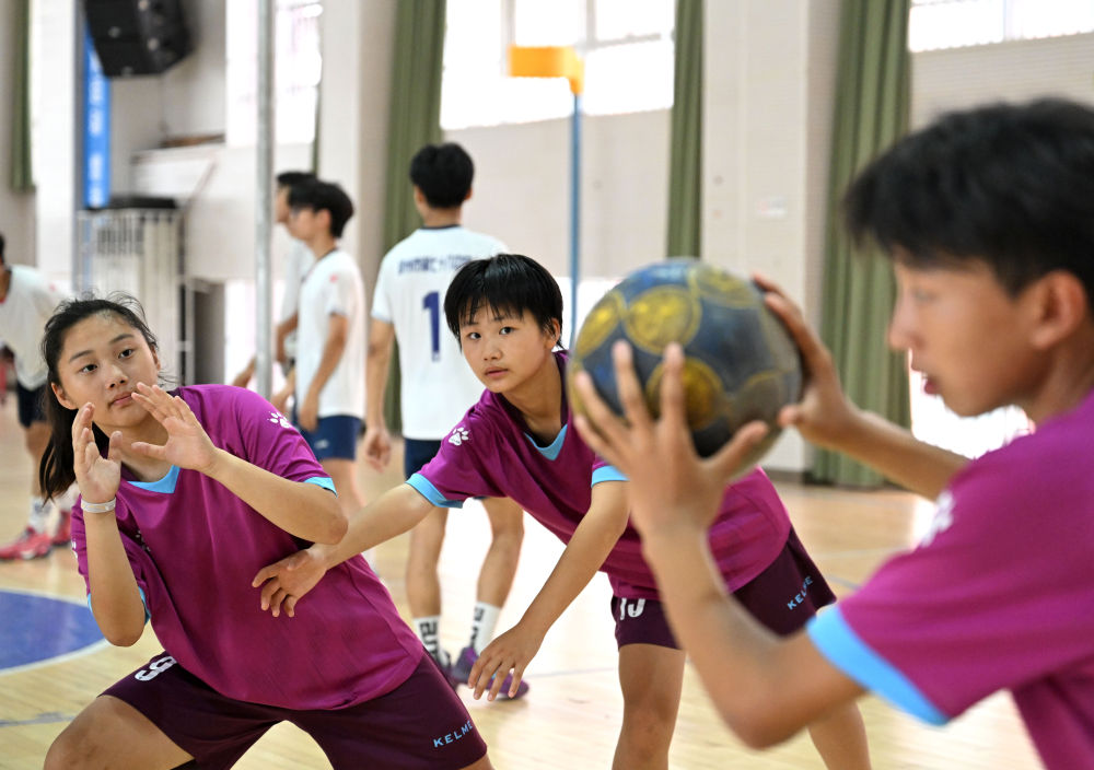 鄭州市第七十六中學(xué)荷球隊球員練習(xí)傳接球。新華社記者 李嘉南 攝