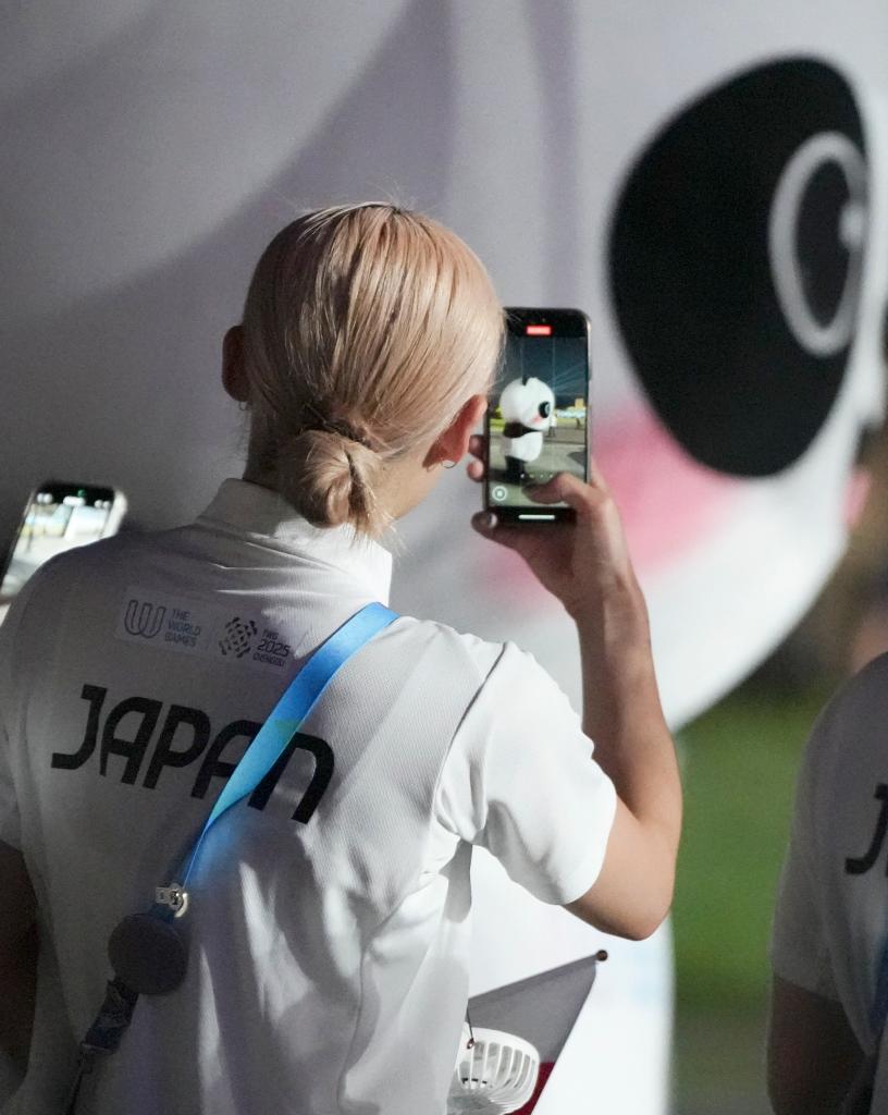 2025年8月7日,一名日本體育代表團成員在開幕式上拍攝吉祥物“蜀寶”。當日,第12屆世界運動會開幕式在成都舉行。新華社記者 胥冰潔 攝