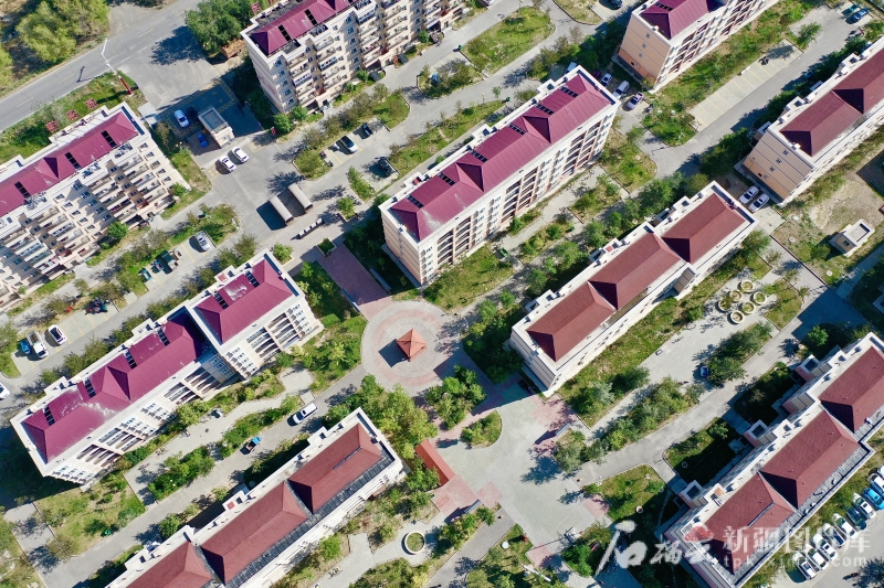 8月12日,昌吉市阿什里鄉(xiāng)的“天鵝小鎮(zhèn)”,一排排整齊的樓房。(無人機(jī)攝)
