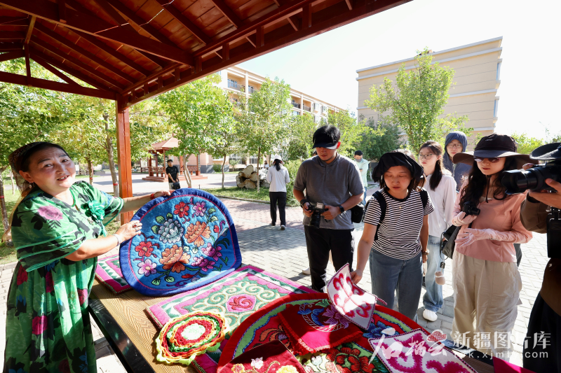 8月12日,哈薩克族刺繡代表性傳承人瑪依努爾向記者介紹哈薩克族刺繡。