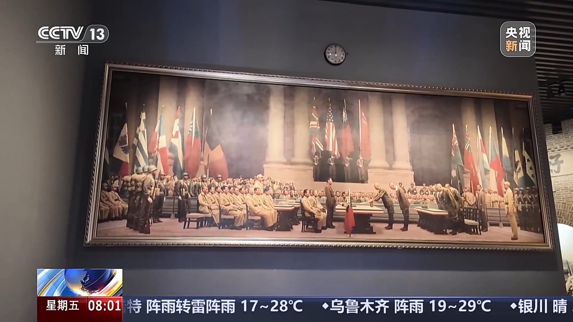 中國人民抗日戰(zhàn)爭紀念館展覽陳列部副主任 韓小昆:左側(cè)畫面有個角落,有一把空白的椅子是沒有畫人物的。整個作品形象里面有200多個人,但唯獨空了一把椅子。這是基于歷史進行的藝術(shù)創(chuàng)作,就是說,在戰(zhàn)爭中犧牲的英烈們也參加了這個受降儀式。