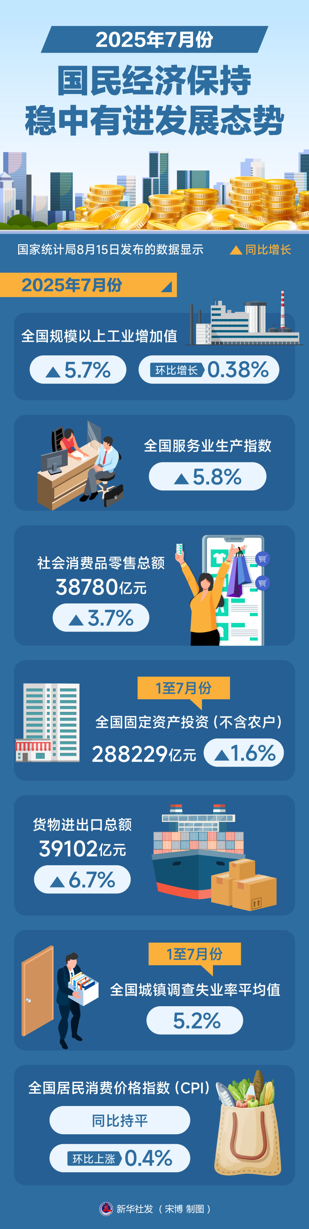 國家統(tǒng)計局8月15日發(fā)布的數據顯示,2025年7月份,國民經濟保持穩(wěn)中有進發(fā)展態(tài)勢,生產需求持續(xù)增長,就業(yè)物價總體穩(wěn)定,新質生產力培育壯大,高質量發(fā)展取得新成效。