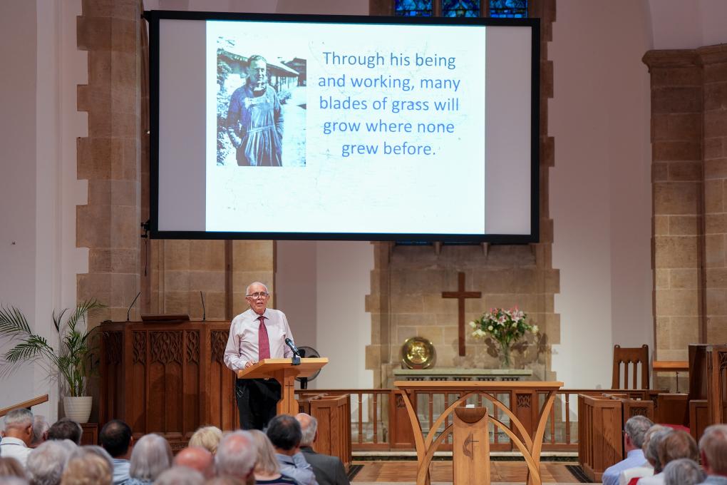 7月22日,在英國赫特福德郡哈彭登鎮(zhèn),喬治·艾爾溫·何克的外甥馬克·艾爾溫·托馬斯在紀念活動上發(fā)表演講。新華社記者 吳魯 攝