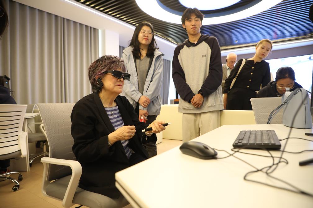 4月15日,在培黎職業(yè)學院,英中了解協(xié)會榮譽主席佐伊·里德體驗學生們親手設計搭建的虛擬現(xiàn)實場景模型。新華社記者 張智敏 攝