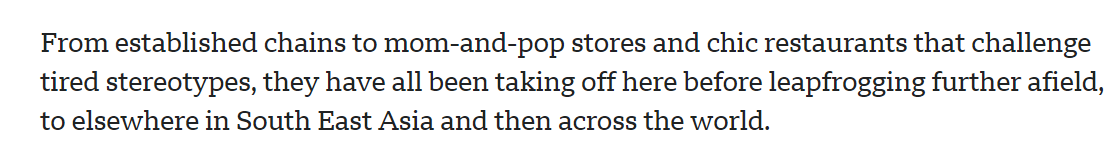 文章說,中國烹飪技藝源遠(yuǎn)流長、博大精深,一桌美食盛宴或許正是中國最有效卻又最被低估的吸引力所在。還是以新加坡為例,商場、公交和地鐵站里,搭配著中國成語的中國美食巨幅亮眼廣告不時閃現(xiàn)。從連鎖巨頭到夫妻小店,再到顛覆刻板印象的時尚餐廳,這些中國美食品牌在向東南亞乃至全球擴(kuò)張前,都已在這個國際旅游城市嶄露頭角。