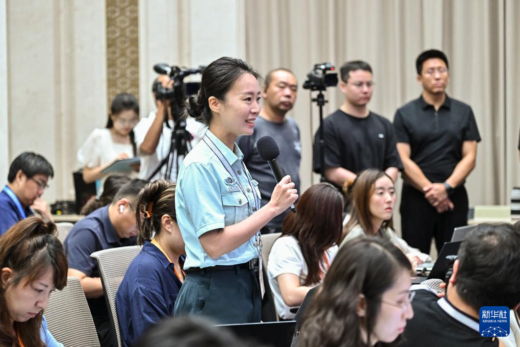 8月20日,國務院新聞辦公室在北京舉行新聞發(fā)布會,閱兵領導小組辦公室副主任、中央軍委聯合參謀部作戰(zhàn)局少將副局長吳澤棵,中國人民解放軍中部戰(zhàn)區(qū)閱兵指揮機構辦公室常務副主任、政治工作部少將副主任徐貴忠介紹閱兵準備工作有關情況,并答記者問。這是記者在現場提問。新華社記者 李鑫 攝