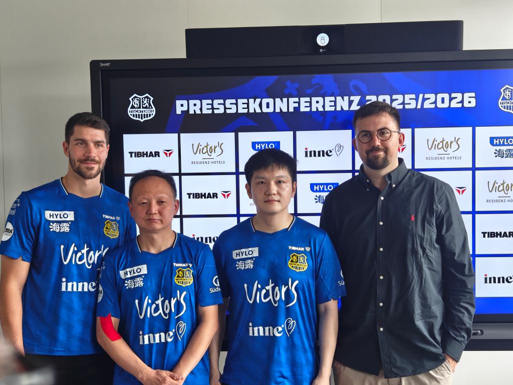 8月27日,中國乒乓球運(yùn)動(dòng)員樊振東(右二)出席德國乒乓球甲級(jí)聯(lián)賽薩爾布呂肯俱樂部的新賽季發(fā)布會(huì)。新華社記者 趙建通 攝