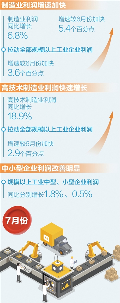 中小型企業(yè)利潤(rùn)改善明顯,私營(yíng)企業(yè)高于全國平均水平。7月份,規(guī)模以上工業(yè)中型、小型企業(yè)利潤(rùn)分別由6月份下降7.8%、9.7%轉(zhuǎn)為增長(zhǎng)1.8%、0.5%,效益狀況改善較為明顯。私營(yíng)企業(yè)當(dāng)月利潤(rùn)增長(zhǎng)2.6%,高于全部規(guī)模以上工業(yè)企業(yè)平均水平4.1個(gè)百分點(diǎn)。