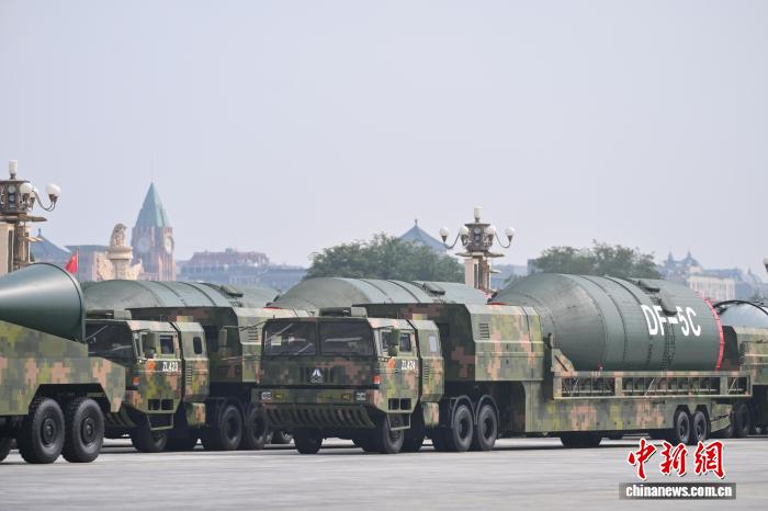 9月3日,紀(jì)念中國(guó)人民抗日戰(zhàn)爭(zhēng)暨世界反法西斯戰(zhàn)爭(zhēng)勝利80周年大會(huì)在北京隆重舉行。圖為核導(dǎo)彈第二方隊(duì)“東風(fēng)-5C”液體洲際戰(zhàn)略核導(dǎo)彈駛過天安門廣場(chǎng)。 中新網(wǎng)記者 趙文宇 攝