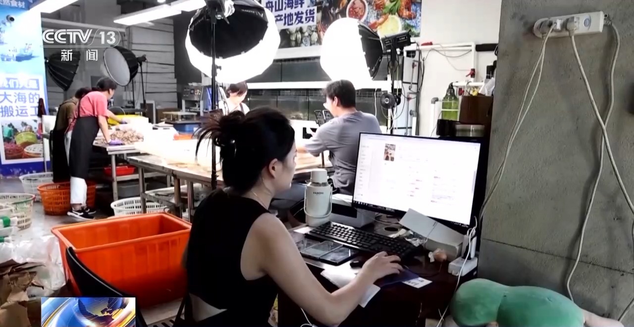 漁船忙著卸貨的同時,在距離碼頭不遠的電商產(chǎn)業(yè)園里,主播們正售賣新鮮上市的梭子蟹。為了縮短發(fā)貨時間,這家店鋪在直播的同時打包海鮮,即買即發(fā),每天可以發(fā)出六到七百個訂單。