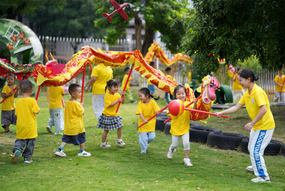 9月5日,四川瀘州白酒產(chǎn)業(yè)園區(qū)天驕托育園的老師帶領(lǐng)孩子們舞龍。新華社記者 江宏景 攝