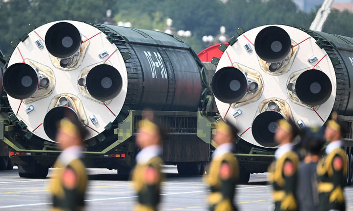 ↑9月3日,紀(jì)念中國人民抗日戰(zhàn)爭暨世界反法西斯戰(zhàn)爭勝利80周年大會在北京隆重舉行。這是核導(dǎo)彈第二方隊(duì)接受檢閱。