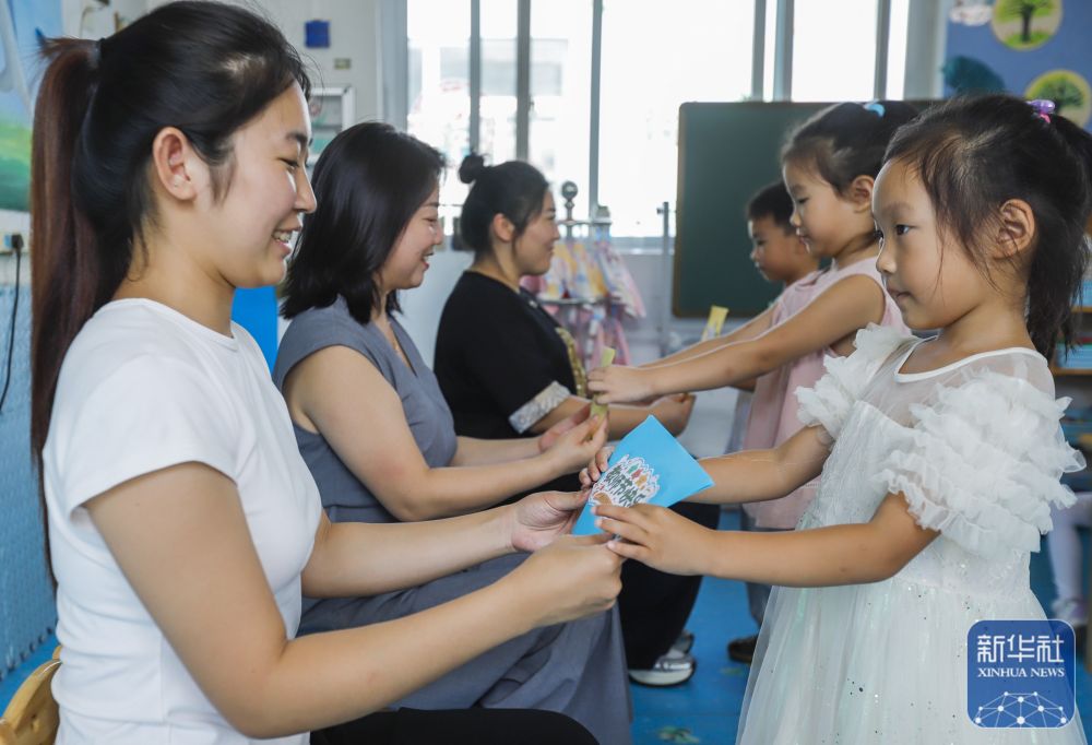 9月9日,河北省遵化市遵化鎮(zhèn)南關(guān)幼兒園的小朋友給老師送賀卡,祝福教師節(jié)。新華社發(fā)(劉滿倉(cāng)攝)