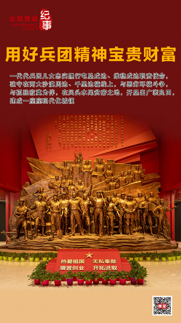 ◇2022年7月,習(xí)近平總書記在新疆考察時(shí)來到新疆生產(chǎn)建設(shè)兵團(tuán)八師石河子市,參觀新疆兵團(tuán)軍墾博物館。會見兵團(tuán)老中青三代建設(shè)者代表時(shí),他強(qiáng)調(diào),新疆生產(chǎn)建設(shè)兵團(tuán)為推動新疆發(fā)展、增進(jìn)民族團(tuán)結(jié)、維護(hù)社會穩(wěn)定、鞏固國家邊防作出了不可磨滅的貢獻(xiàn)。兵團(tuán)人鑄就的熱愛祖國、無私奉獻(xiàn)、艱苦創(chuàng)業(yè)、開拓進(jìn)取的兵團(tuán)精神,是中國共產(chǎn)黨人精神譜系的重要組成部分,要用好這些寶貴財(cái)富。