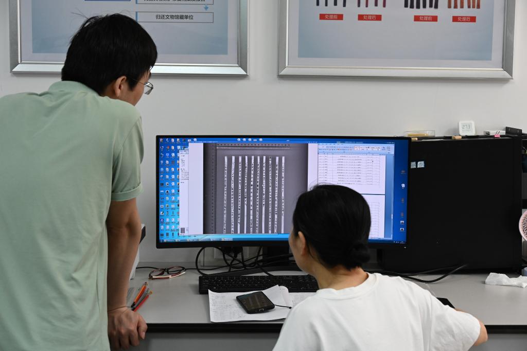 在荊州文物保護中心,工作人員檢查掃描后的竹簡文字。新華社記者黃曉勇 攝
