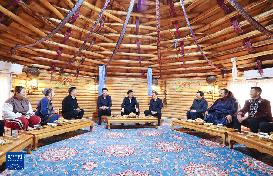 9月27日,受習(xí)近平總書記囑托,中共中央政治局常委、全國政協(xié)主席、中央代表團(tuán)團(tuán)長王滬寧帶領(lǐng)中央代表團(tuán)部分成員到阿勒泰地區(qū)布爾津縣考察。這是王滬寧和中央代表團(tuán)部分成員在扎拉特鄉(xiāng)村旅游專業(yè)合作社同村民交流。新華社記者 姚大偉 攝