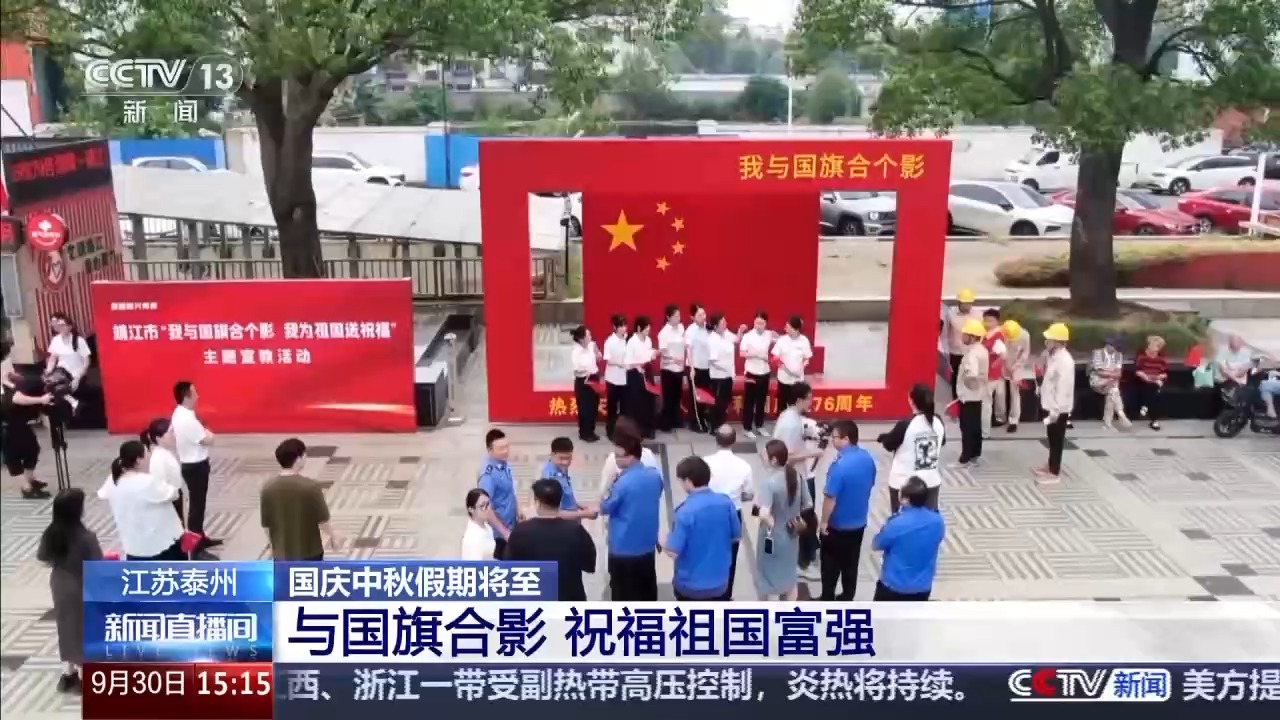 為迎接國慶,這幾天江蘇泰州的主要道路、社區(qū)廣場上都掛滿了國旗。當?shù)剡€啟動了“我與國旗合個影”的打卡活動,吸引了許多市民游客參與。