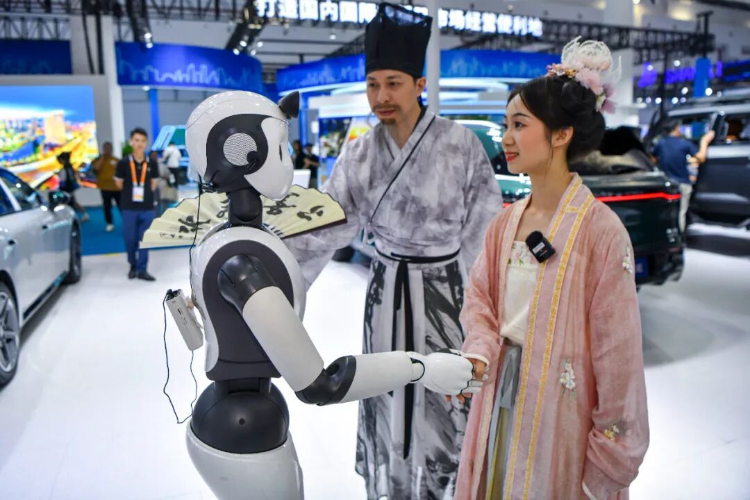 2024年4月15日,海南???,第四屆中國國際消費品博覽會上,身著漢服的參觀者與“柔美人形智能服務(wù)機器人”互動。中新社記者 駱云飛 攝