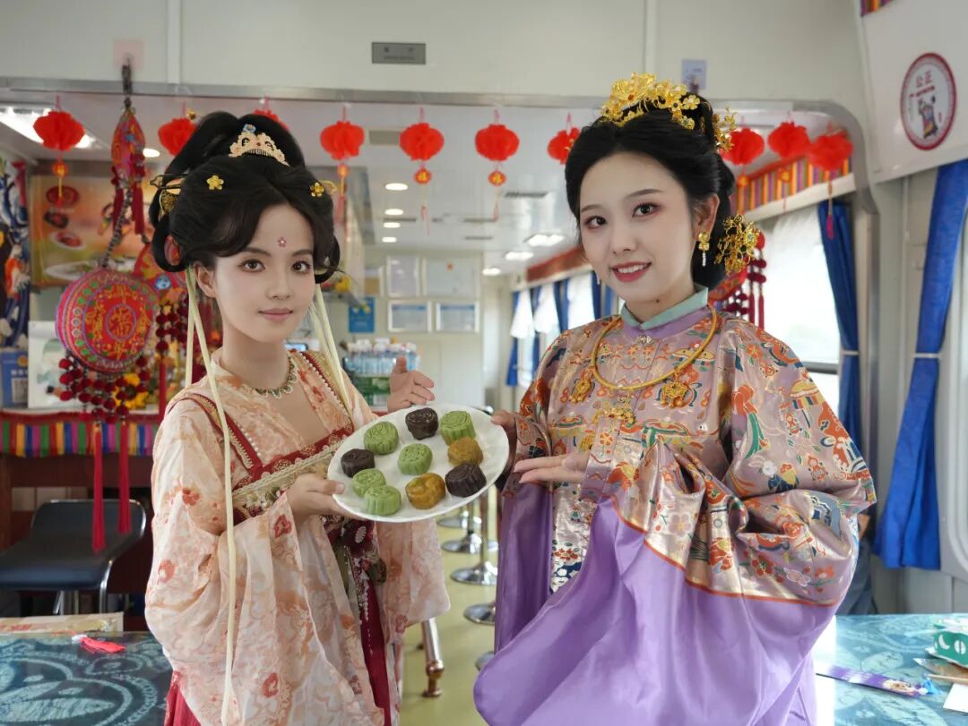 “旅客朋友們,歡迎乘坐本趟列車,中秋佳節(jié)將至,我們在2號餐車準(zhǔn)備了特色活動,誠邀大家共慶佳節(jié)!”列車長李文雯的聲音通過廣播傳遍車廂。隨即《納西三部曲》旋律響起——身著絢麗民族服飾的列車員們,拉著周圍旅客一同跳起納西族舞蹈,歡快的節(jié)奏瞬間點(diǎn)燃車廂氣氛。