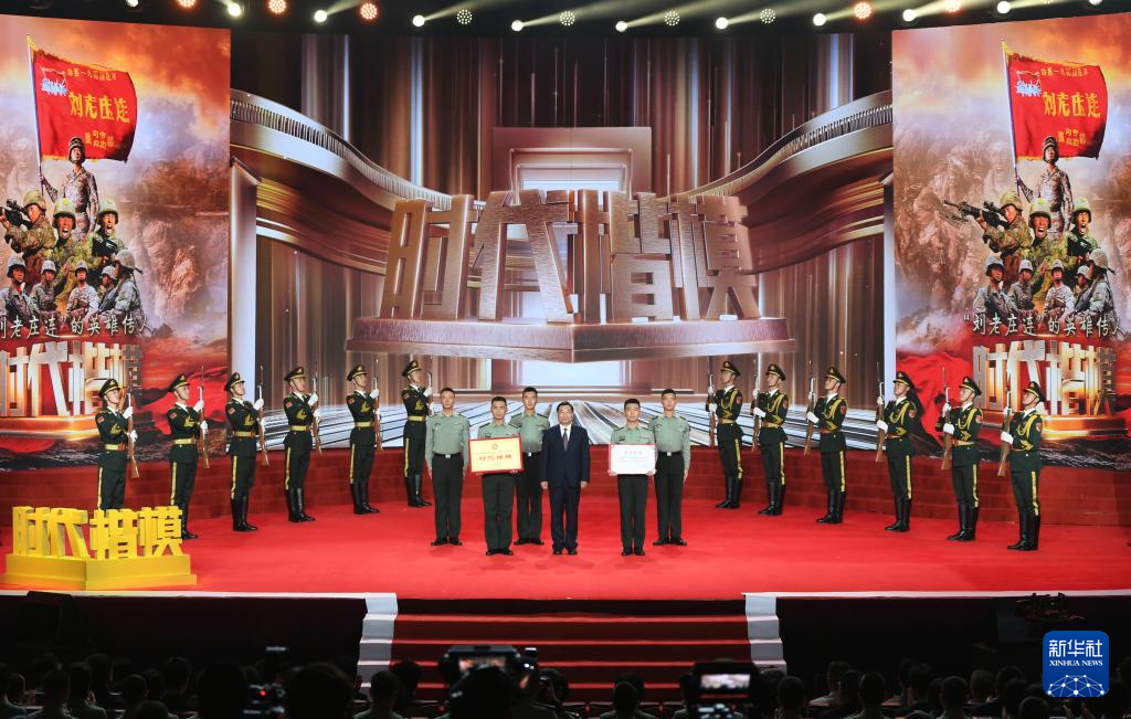 在“時(shí)代楷?!卑l(fā)布儀式上,陸軍某合成旅合成二營(yíng)裝甲步兵一連(“劉老莊連”)官兵代表領(lǐng)取“時(shí)代楷?!豹?jiǎng)牌和證書(shū)(9月29日攝)。新華社記者 張永進(jìn) 攝