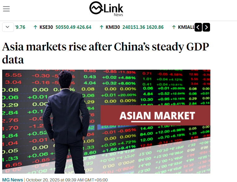 巴基斯坦金融網(wǎng)站Mettis Global Link發(fā)表題為《亞洲股市響應(yīng)中國穩(wěn)健GDP數(shù)據(jù)普漲》的文章。文章分析稱,亞洲市場20日迎來開門紅,得益于中國的最新經(jīng)濟數(shù)據(jù)。中國第三季度GDP同比增長4.8%,同時維持貸款市場報價利率(LPR)。股市方面,香港恒生指數(shù)大漲逾2%,內(nèi)地滬深300指數(shù)上漲0.74%。日經(jīng)225指數(shù)飆升近3%,首次突破49000點大關(guān),東證指數(shù)上漲2%。