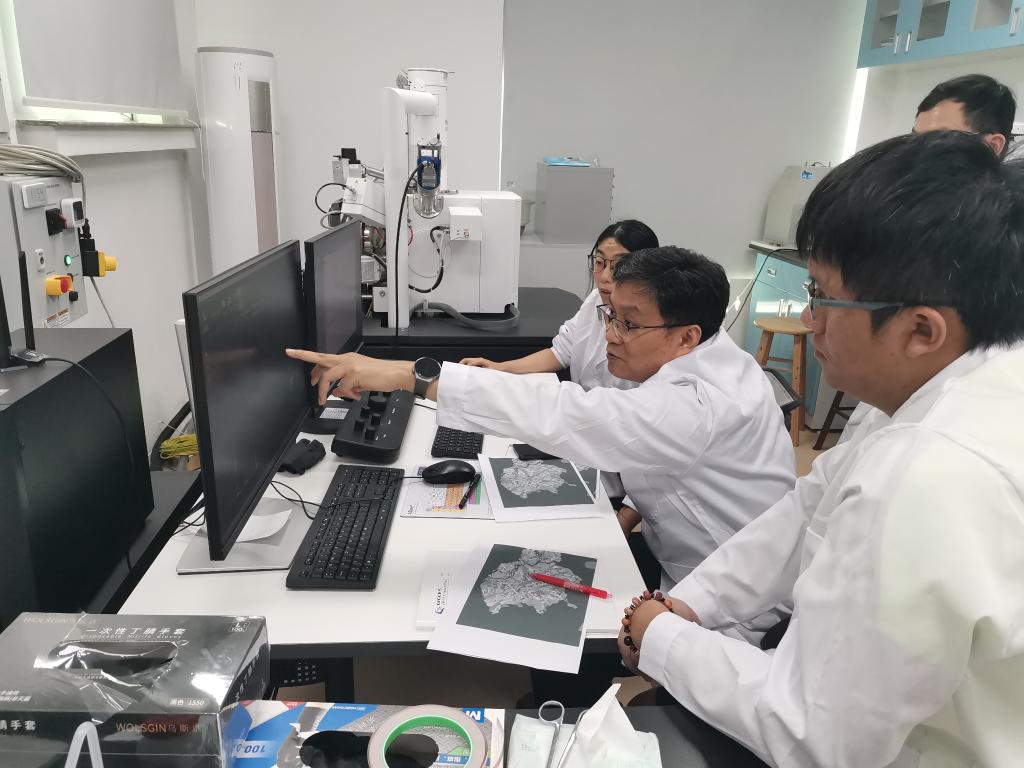 2024年8月26日,徐義剛院士與團(tuán)隊(duì)成員通過掃描電鏡觀察嫦娥六號樣品特征。(中國科學(xué)院廣州地球化學(xué)研究所供圖)