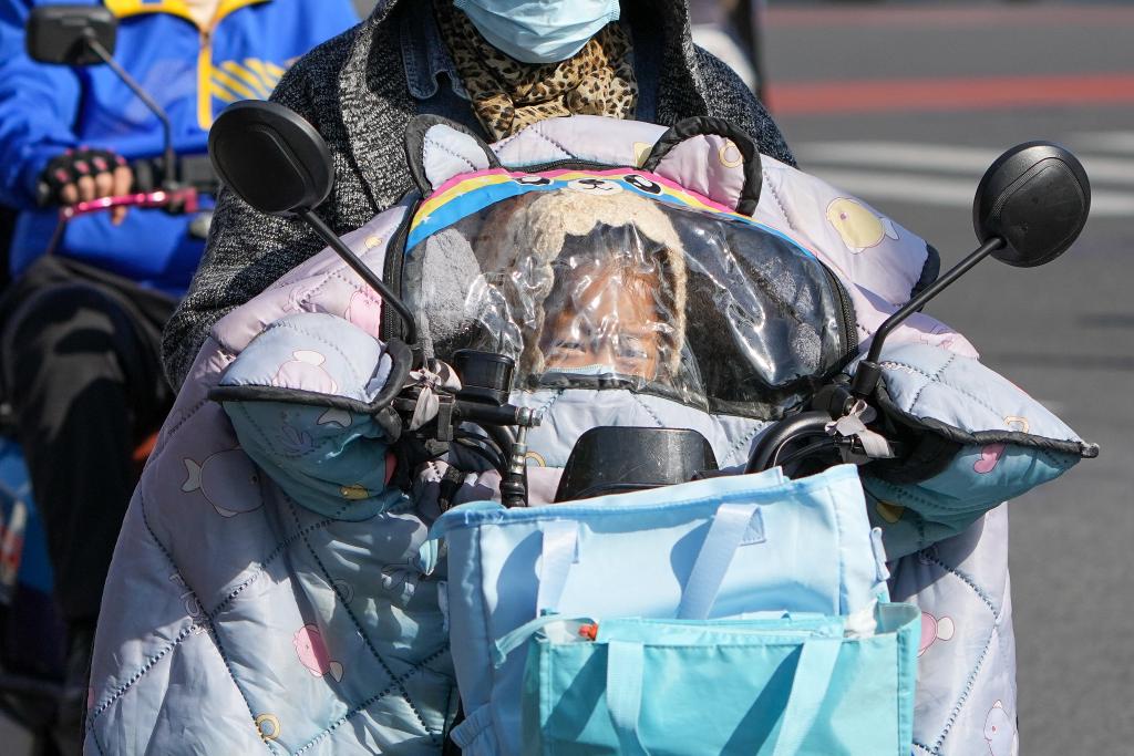 10月18日,一位小朋友在電動自行車的擋風后面躲風。新華社記者 鞠煥宗 攝