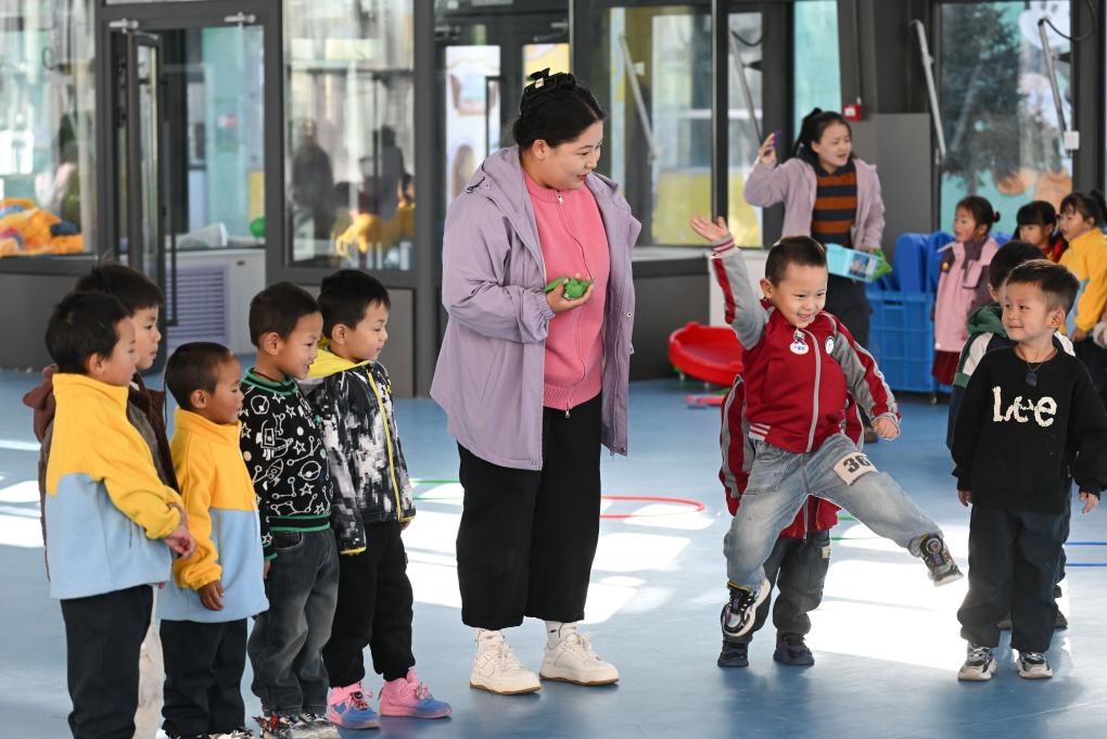 2024年11月14日,在青海天峻縣民族幼兒園,小朋友們?cè)诶蠋煄ьI(lǐng)下上體育課。新華社記者 張龍 攝