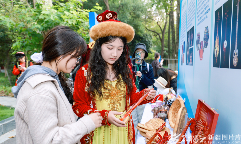 10月27日下午,南京師范大學(隨園校區(qū))學生在欣賞新疆樂器。石榴云/新疆日報記者 甘興華攝