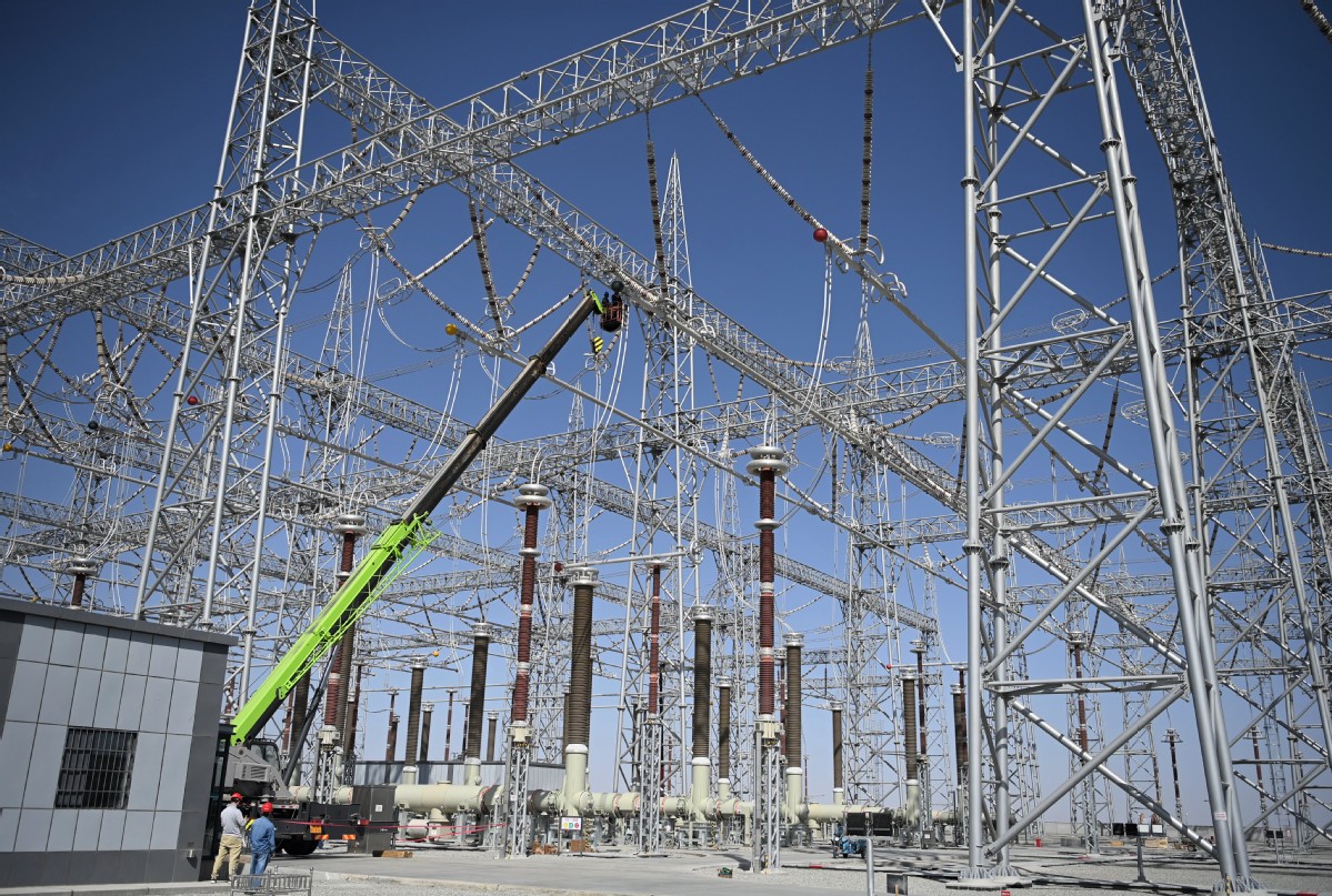 2025年9月28日,且末750千伏變電站新建工程建設現(xiàn)場,作業(yè)人員對管母金具進行檢查復驗。(馬元 攝)