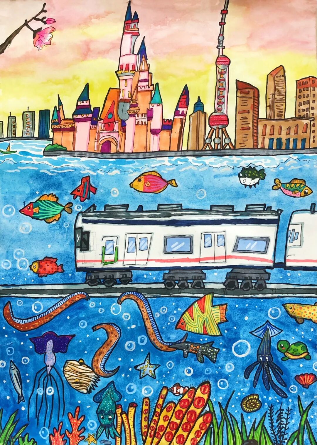 不遠(yuǎn)處徐鹽高鐵上,銀白色的高鐵像一道流星劃過水鄉(xiāng)。我的鉛筆在本子上沙沙作響,把窗外的景色畫下來:成片的藕田里,粉白的荷花搖曳生姿;戴著斗笠的農(nóng)民在稻田里忙碌,身后的水渠泛著粼粼波光。列車員阿姨推著小推車走來,“瓜子飲料礦泉水”的吆喝聲,和車輪與鋼軌的碰撞聲交織在一起,成為獨屬于旅途的音樂。