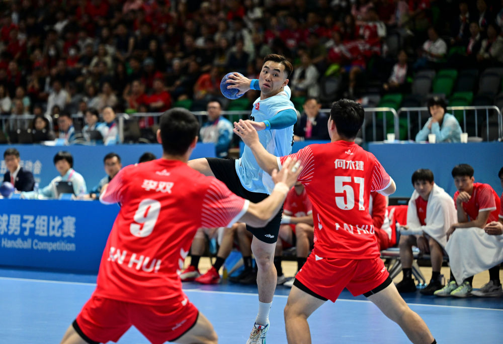 11月8日,在香港進(jìn)行的第十五屆全國(guó)運(yùn)動(dòng)會(huì)男子手球半決賽中,香港隊(duì)球員連潤(rùn)滔(中)在比賽中射門。新華社記者 于洋 攝