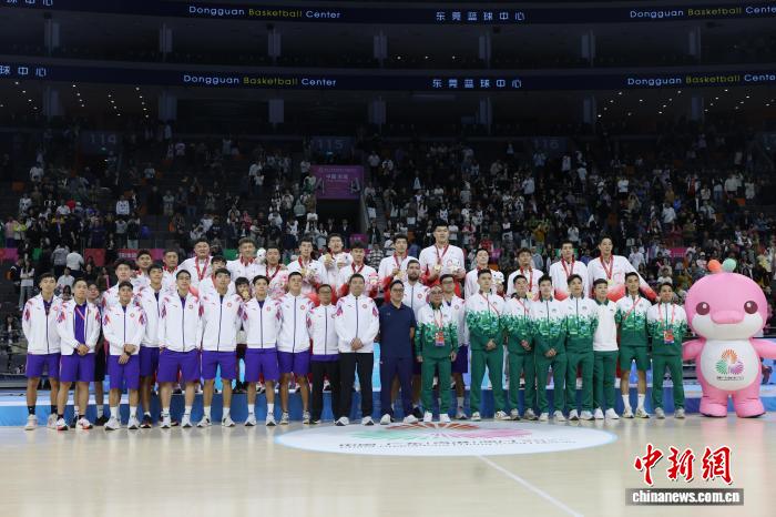 11月12日晚,第十五屆全國運動會籃球項目男子成年組金牌賽在東莞籃球中心舉行,廣東隊101比65戰(zhàn)勝浙江隊奪得金牌。圖為頒獎儀式后,廣東隊、香港隊、澳門隊合影。中新社記者 盛佳鵬 攝