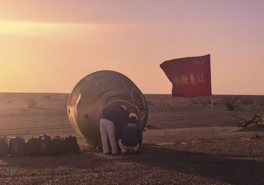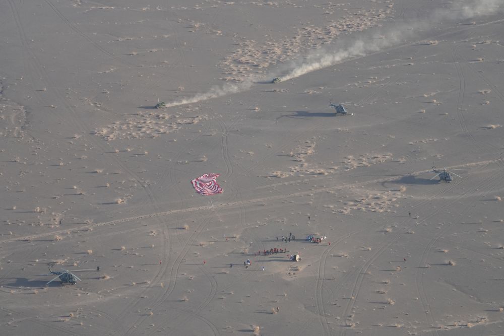 14日下午,返回艙主傘打開(kāi)瞬間,酒泉衛(wèi)星發(fā)射中心李斌斌已鎖定跟蹤,實(shí)時(shí)畫(huà)面?zhèn)飨蛑缚卮髲d??罩蟹株?duì)、地面分隊(duì)等向落點(diǎn)集結(jié),共同搭建起“空地一體、立體協(xié)同”多維搜救體系。